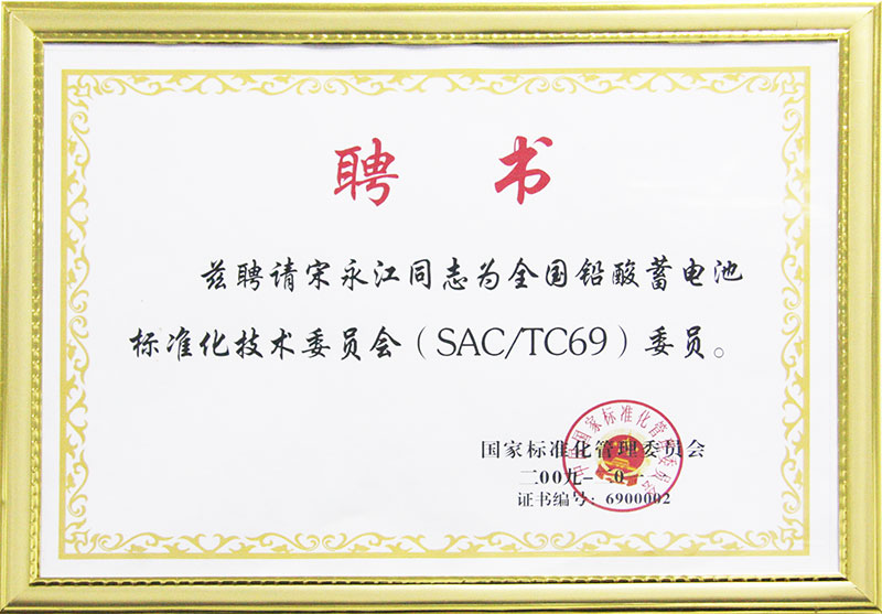 全國鉛酸蓄電池標準化技術委員會委員聘書