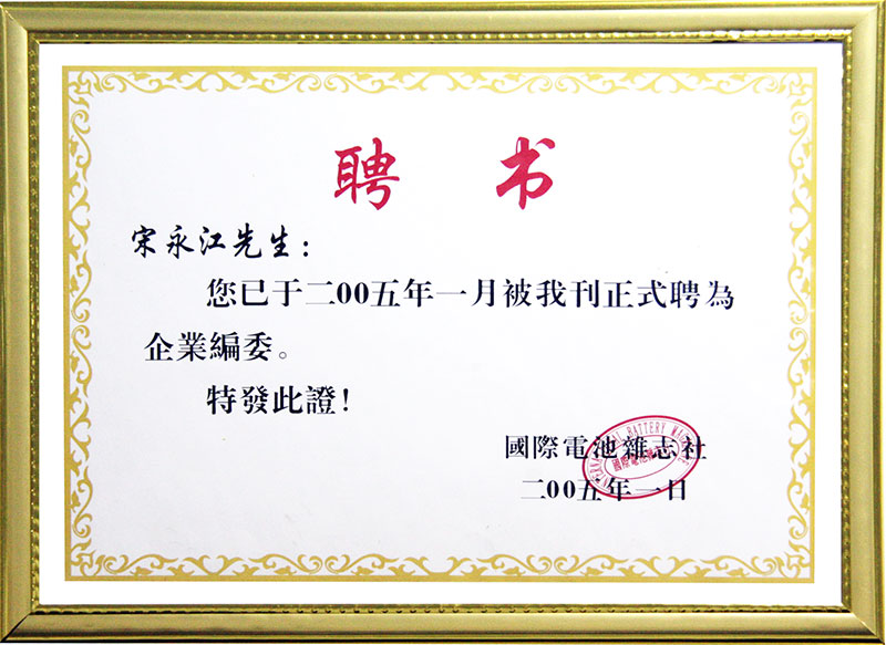 “國際電池雜志社”企業編委聘書