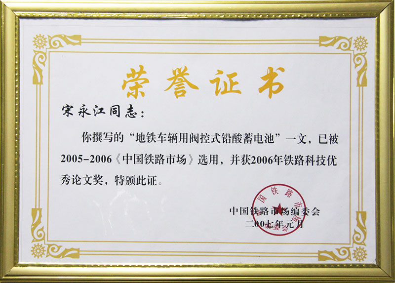 《地鐵車輛用閥控式鉛酸蓄電池》論文獲2006年鐵路科技優秀論文獎