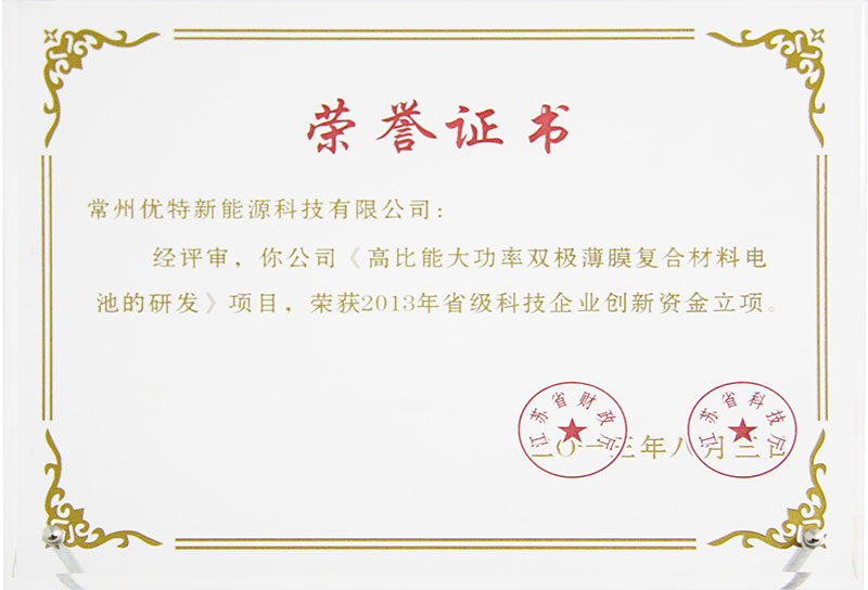 2013年江蘇省科技型企業創新資金立項證書